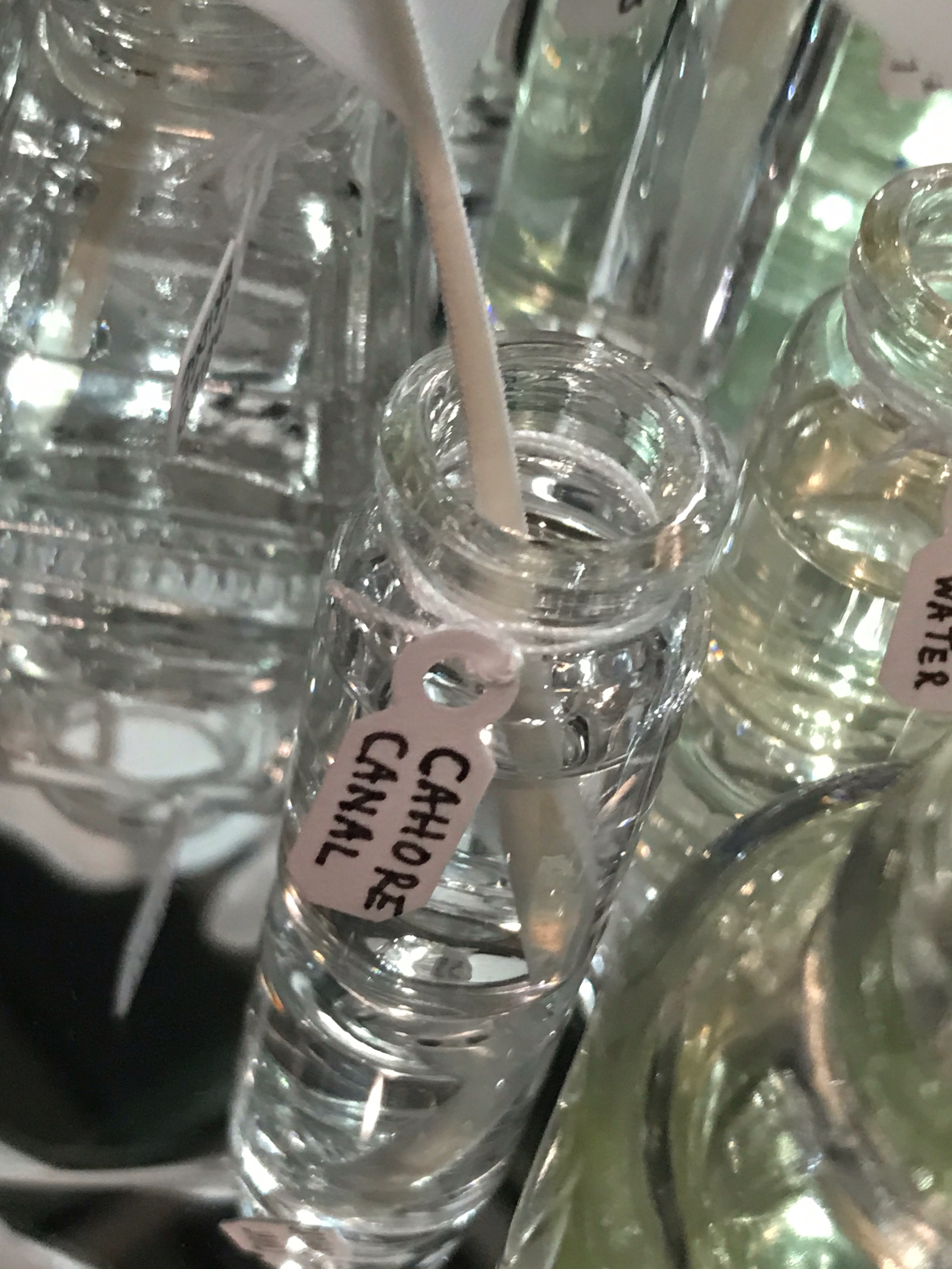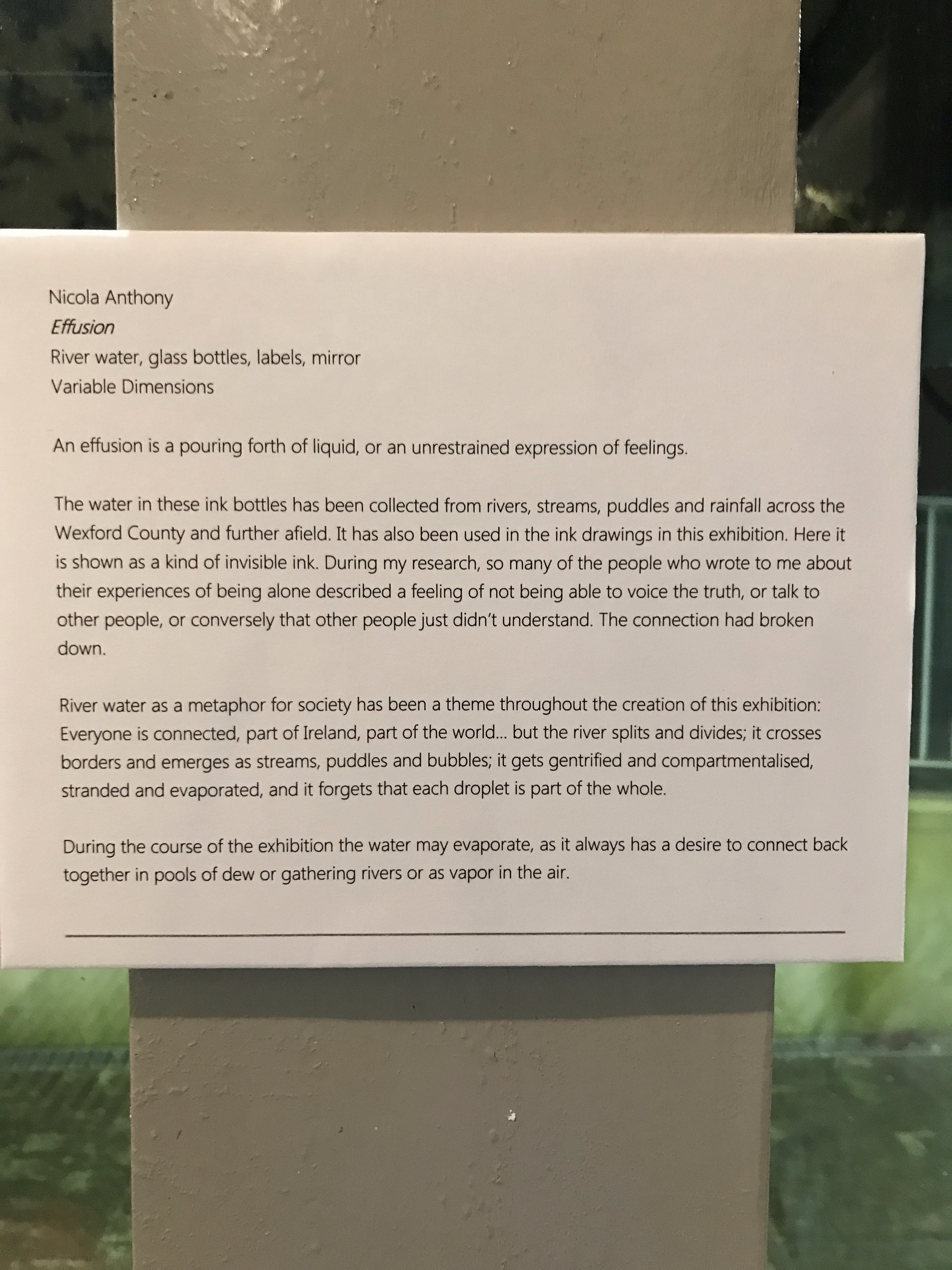 The following artwork seeded adjunct to the main pieces and the stories collected. There was no real bridge from it to the community work and it was controversial to me. While it reminded me of Gary Coyles work from 2010 it did not seem to have the same authenticity. Coyles daily collection of salty sea water from his swims looked like murky different tides and saline conditions. The following work was pristine not like Cahore canal or puddles it felt like it was sanitized for perfect picture pure images that ruined the premise.
