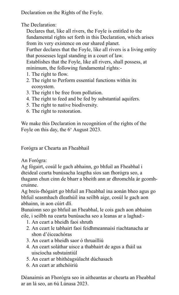 The rights of the River Foyle connects deeply to the river catchment environmental awareness and growing work on clean water. That work further shapes the ideas of bioregional environmental and economic development. I’ve begun to speak about it as the basic layer of rock, where the river comes from that rock to find its way to our seas. In an Irish context when we peel back colonisation and partition to bedrock of our shared island it gives us a different context. I believe it has the potential to offer us new ways towards a future shared Island narrative. When we access time outside of our Western colonised mindset and jump 7 generations into the future we have the potential to move beyond current lived realities and culture. We open ourselves up to living from the future rather than from the past. A radical act of imagination, hope and possibility. Right now we need that in spades.