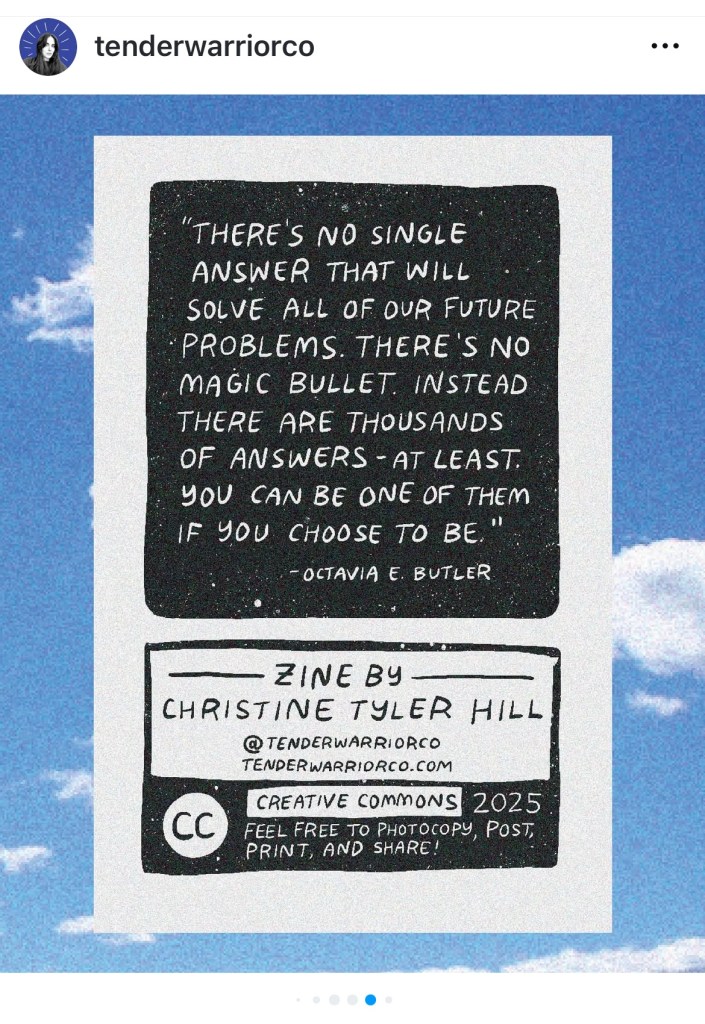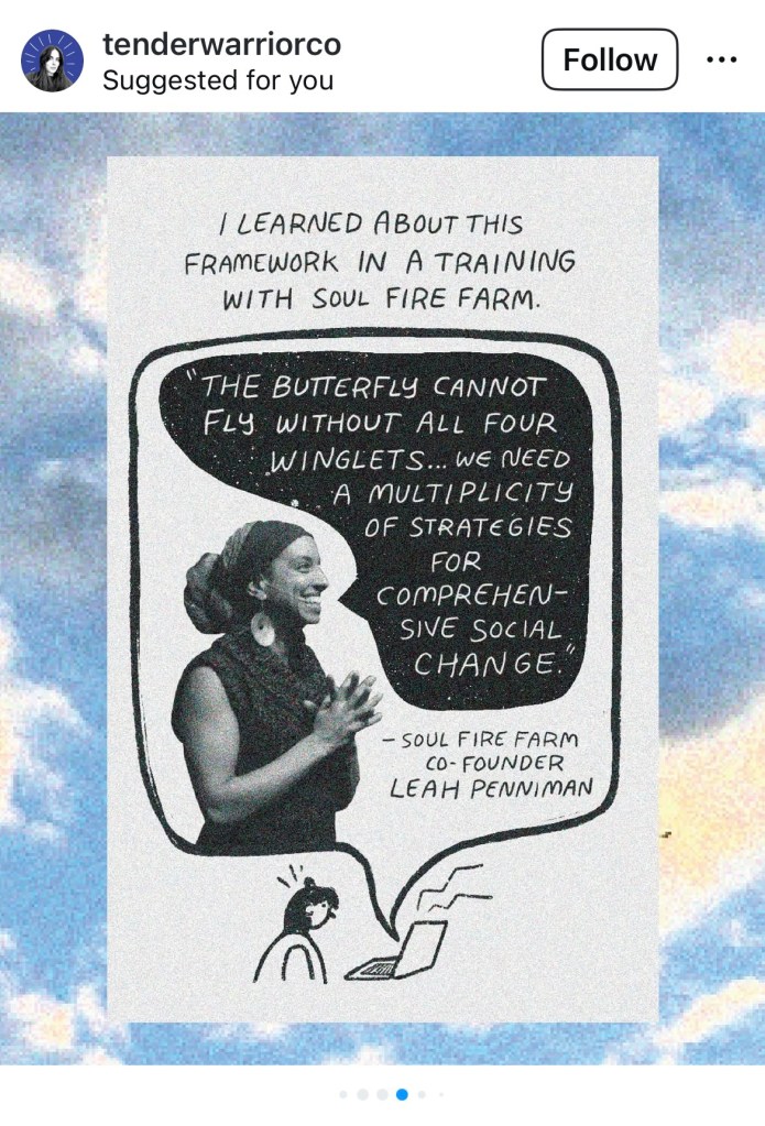 Let’s be clear there are two women’s brilliance at play here. I’m consciously calling out both, the training and framework by Leah Penniman and the communication and illustration in a zine by Christine Tyler Hill. The artist and illustrator that shared the zine, here’s a link to here post on instagram.