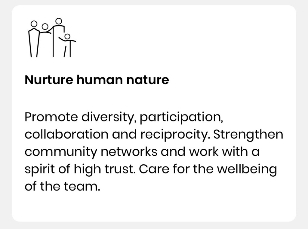 Promote diversity, participation, collaboration and reciprocity. Strengthen community networks and work with a spirit of high trust. Care for the wellbeing of the team.