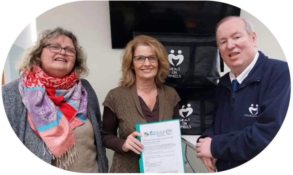 at the launch were Roisin Markham, the Facilitator for the Courtown Circular Economy Plan, Linda Sinnott, Chairperson Courtown Community Council, and Colin Webb, Chairperson Gorey Meals-On-Wheels.