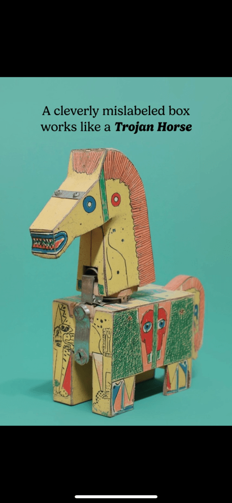 Perhaps it’s the quality of how they were made or the metaphor of both. Trojan Horses have been present for a few months in my imagination. Through a visual conversation with Orlagh O’Brien last week they have come to the fore again. It’s a slightly uneasy metaphor of war and deception that I’ve been unpacking. This clever idea of a “mislabeled box is a trojan horse” fits more easily within my value system, I say more later.
