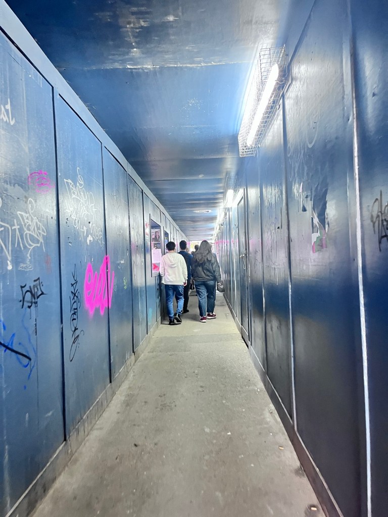 An artist had started with blank walls and a simple invitation to have your height measured. A simple line of a sharpe marker above your head, a dash of black against the white box walls with your name and the date it was recorded. The story of the work is beautifully told. I listened to it silently reading the transcribed words. The 16:28 Rosslare diesel train mechanically rattling and ruffing, passengers boarding. Darts pulling in and out. People bumping into acquaintances, phone calls, rustling paper, straws and slurps of iced coffee as the train filled up getting ready to go.