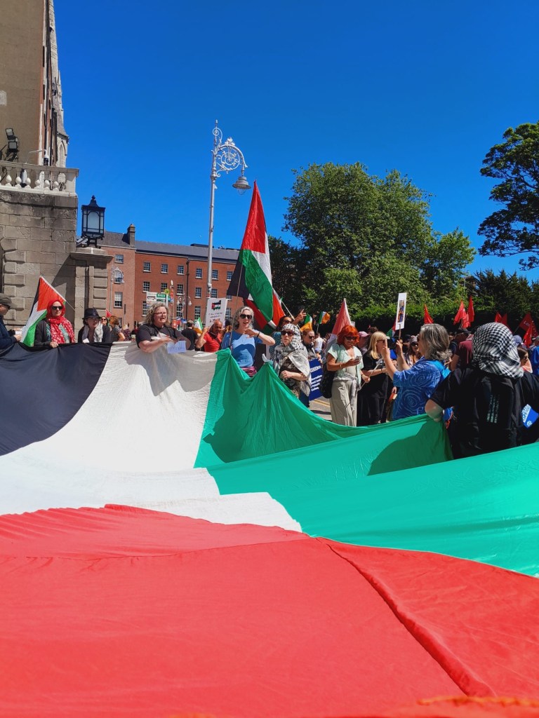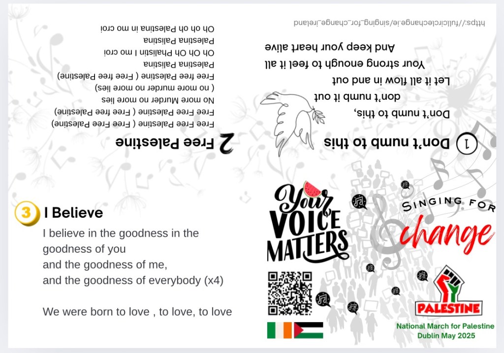 I sang for most of the march. Walking with Singing for Change Ireland a new group forming, We walked towards the back near Pals for Palestine. I’ll include links in the resources.