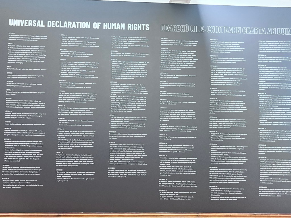 I stood reading the UN human rights, it was so moving. Floor to celling in Irish and English. As I read each one I thought Isreal is in breach of this one, and this one, and this one. It’s in breach of every single one. Palestine was so present, the children, the devastation. Israel’s war on the Gaza Strip the increasing encroaching on occupied West Bank. The sheer horror that been the rolling genocide of Palestinians.