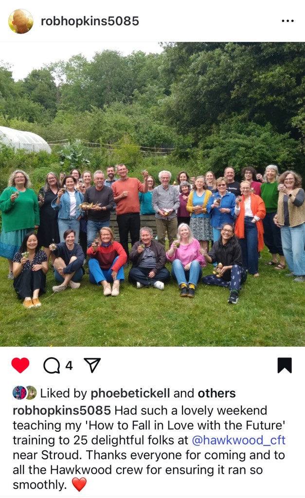 The training in Hawkswood with Rob Hopkins is the first time I really understood what it might mean to be a Time Traveller. I have always had the ability to time travel even before I knew that’s what it was called. Now perhaps I am part of an emergent movement of positive futurists an imagination activist.