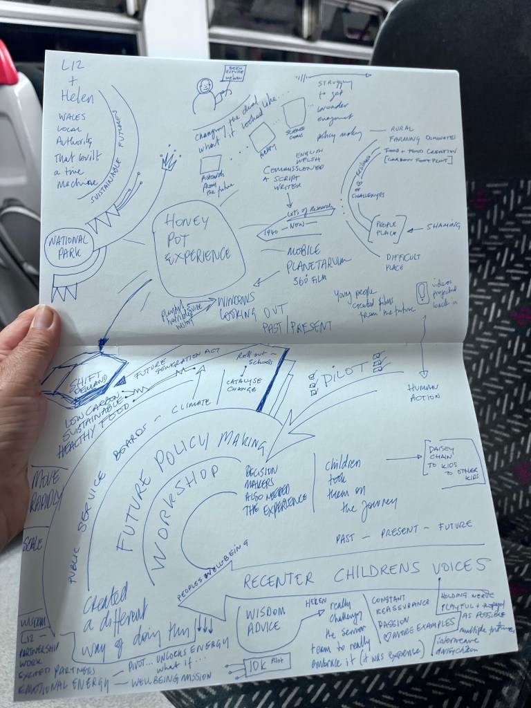 On Sunday morning we got to meet two of the women behind Wales first time machine built in The Bannau Brycheiniog National Park (BBNP). An astonishing story of public policy making, recentering children’s voices. They spoke about making a honey pot experience.