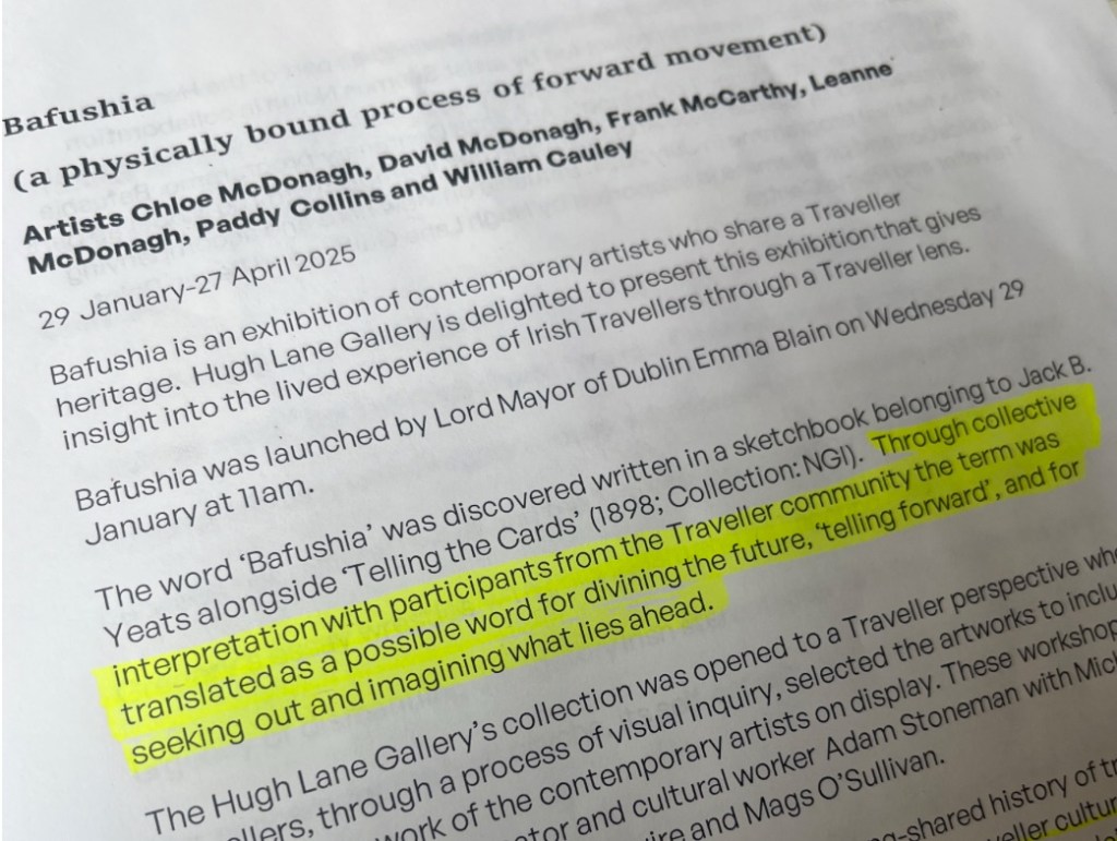 “The word ‘Bafushia’ was discovered written in a sketchbook belonging to Jack B. Yeats alongside ‘Telling the Cards’ (1898; Collection: NGI). Through collective interpretation with participants from the Traveller community in a collaborative arts project led by artist Séamus Nolan and the Sligo Traveller Support Group in partnership with CAIRDE Sligo Arts Festival, the term was translated as a possible word for divining the future, ‘telling forward’, and for seeking out and imagining what lies ahead. While we have not been able to find any record of the word Bafushia being used by Traveller groups or anyone else, through the workshops with Traveller participants, an open and transparent process of inquiry led to the possibility that Bafushia might have been a localized term, reflecting how language evolves and gains meaning when spoken. The group’s collective speculative understanding of the word was one of being physically rooted while imagining the future—much like how the word Bafushia itself was a product of the group’s speculation.”