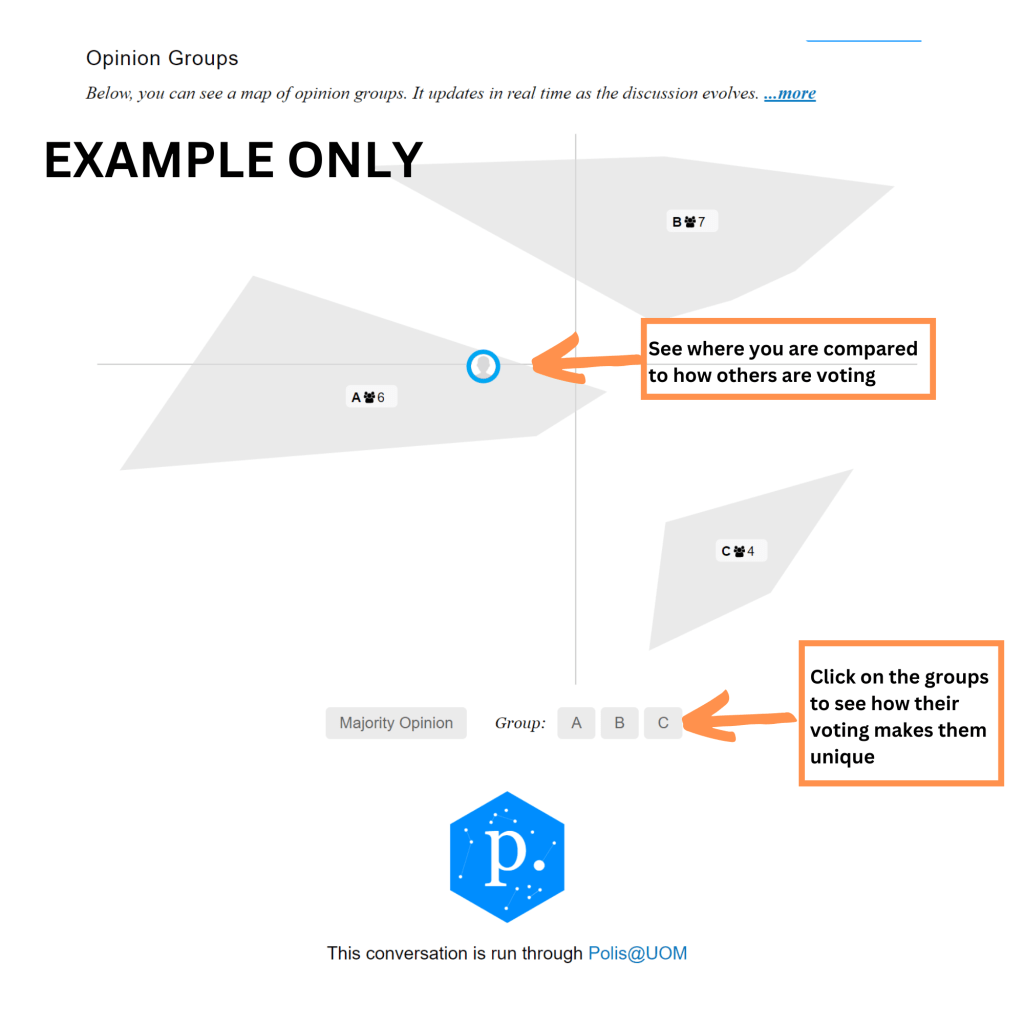 - It shows you where everyone stands: Pol.is uses a smart bit of technology (think of it like a very clever cartographer for ideas) to visually map out who agrees with whom, where the major points of consensus are, and where opinions genuinely diverge. You see clusters of similar viewpoints and the statements that bridge different groups.