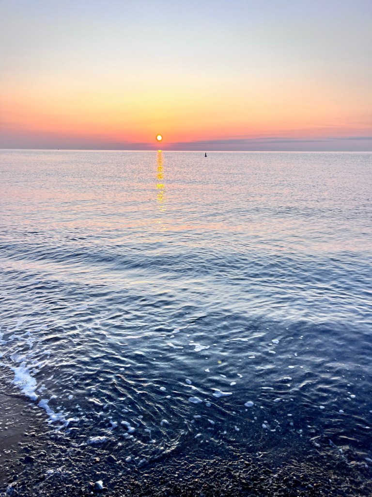 The iridescent charming of the sea by the blush of the sun upon it so early in the day.