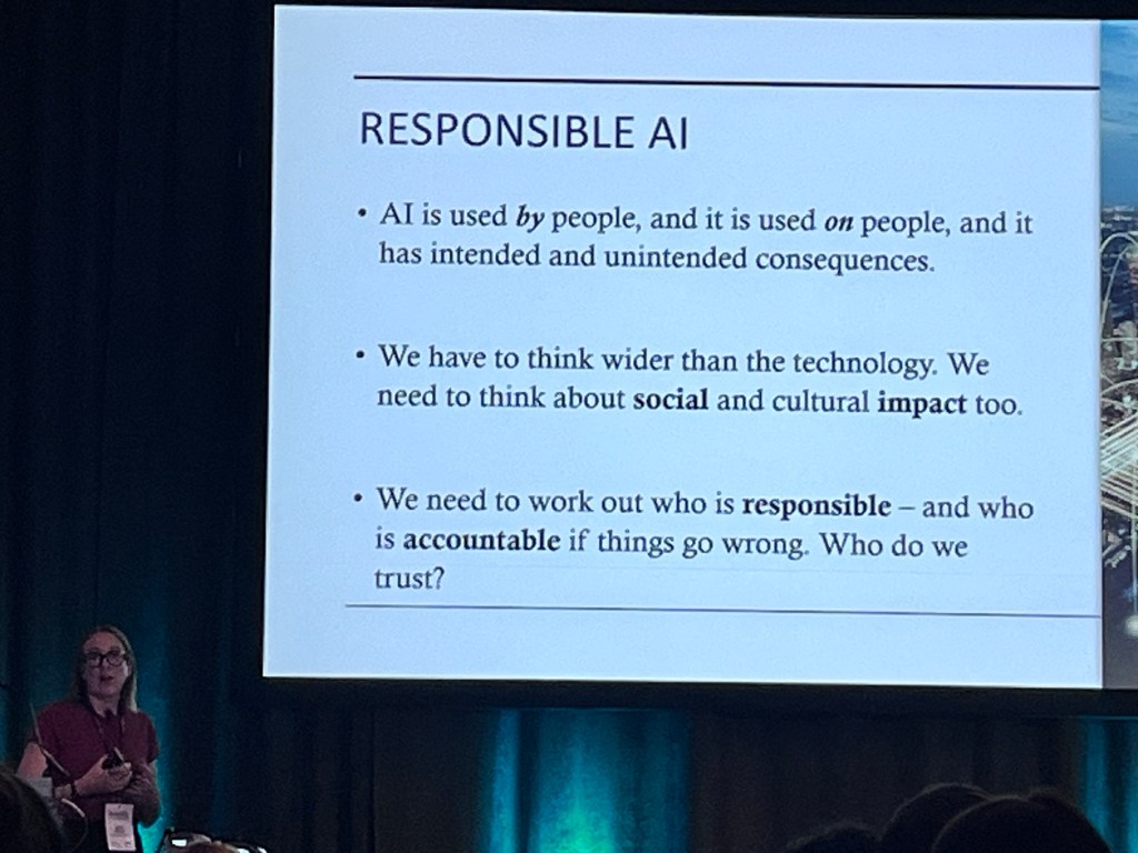 Instead I opted to go to the Plenary: Artificial Intelligence Thematic Session. Three talks & Panel Discussion. What was I thinking culture over tech? I am a technologist. I don’t agree with all of LLM’s hype, or predictive analytics on steroids ~ which is what we are actually calling generative AI. I’ve serious reservations about its impact on material use, energy, water usage and land conversion and the accelerated impact of usage on climate and the environment. But as a data realist that stores information in the cloud I also wanted an opportunity to listen to experts. Paul McBride and I worked together in our early careers in Microsoft, he was brilliant then and is still brillant so I opted to hear him talk. We’d managed to catch up on life stuff at the BBQ the evening before and it was great to meet his business partner Meave Bleajene.