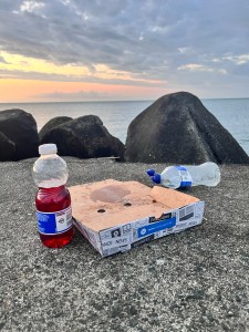 Take away boxes, coffee cups, plastic drink bottles, clothes, runners, towels strewn about. A group of crows feasting off an over flowing bin. The wind tossing through loose waste distributing plastic and other rubbish.
