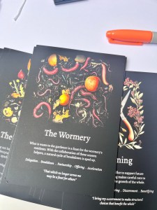 The Tending to Endings cards for me come from the thinking houses of the work that reconnects, decolonisation and hospicing modernity, building in good ruins, mycelium, soil health and gardening wisdom.
