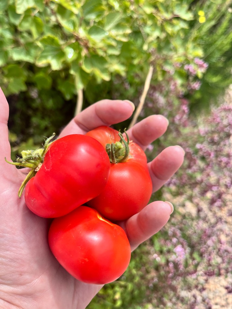 My harvest of first tomatoes was delicious. This was a week of refreshed working space also delicious), writing, visits from friends I also work with, on going dejunking and clearing in the house and thistle removal from parts of the garden.