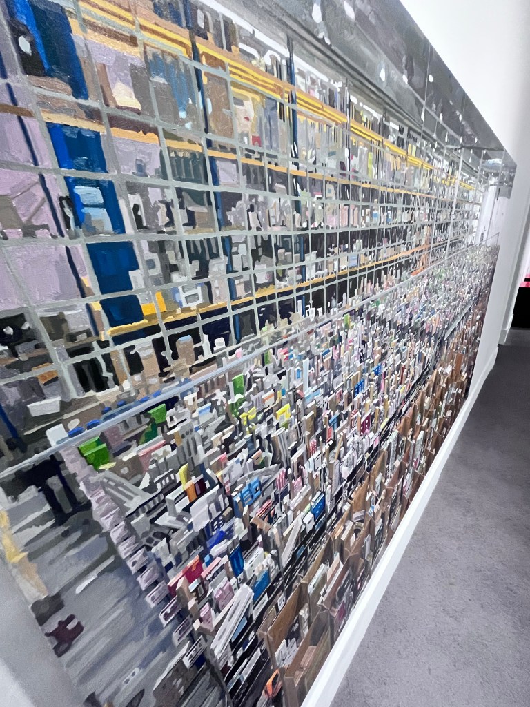 That work has a deepening relationship in the technology offensive of automation of art through large language models and visual vomit being produced by AI. As it does to the large canvases painted in oils opposite it in the exhibition that explore modernism at scale, the warehouse of an e-commerce site. Not a favourite but still a fascinating subject for someone to paint in such a meticulous way.