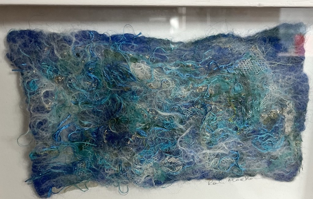 The piece of handcrafted felt is embellished with different fibres of silk, found fishing plastic, materials and all sorts of other fibres added before I felted this piece. Bringing a rich texture and tonal range to this piece.