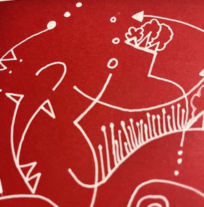 My doodling has developed a style of its own that I am now happy to call drawing. I love the graphic quality of what happens on the page or wall. I also enjoy the motifs of leaves and trees which have been present and the emergence of other animals, the appearance of hands in contained spaces representing the ongoing unbearable Palestinian genocide. Recently a person appeared. I don’t consciously think about what I draw it really is a free line.