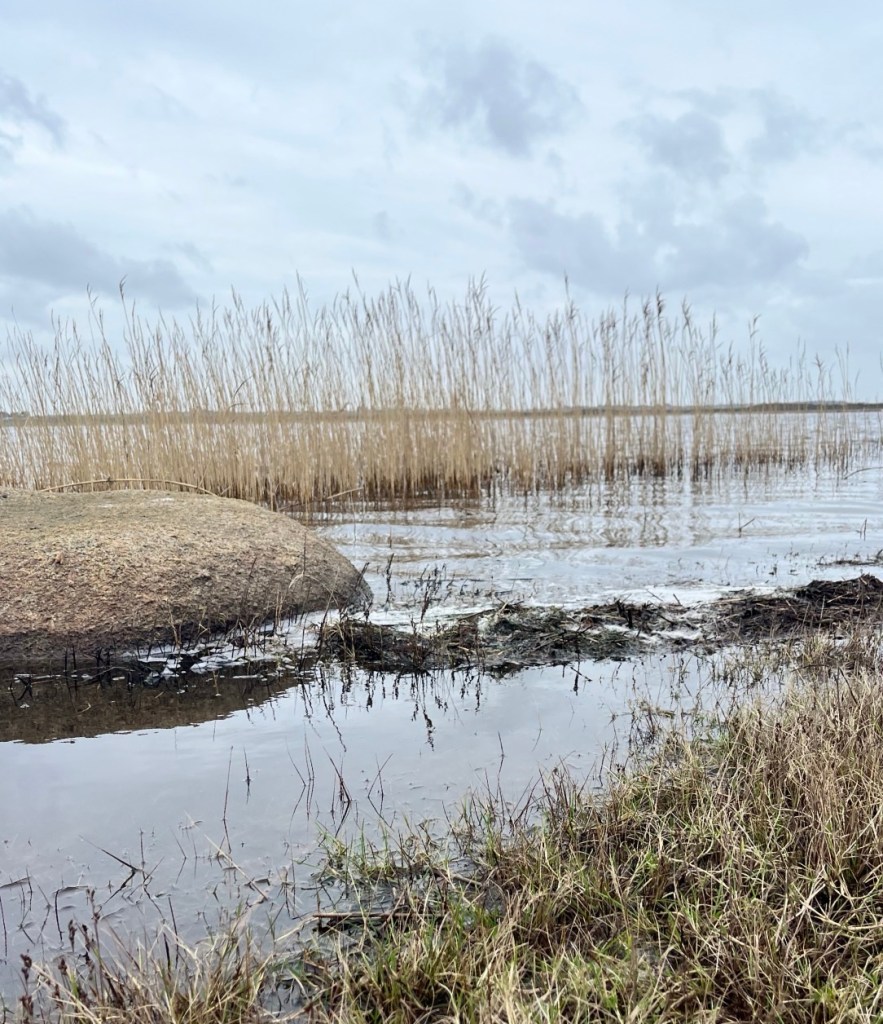 Washed out greyness heightens the contrast, the reeds pop in a muted hue.