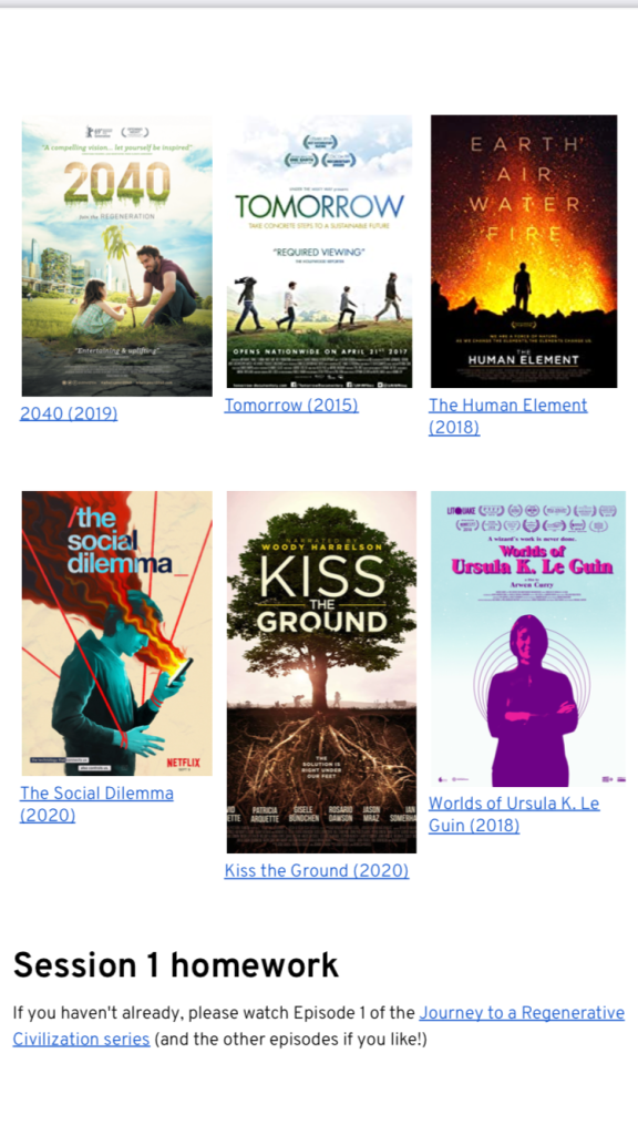 The idea of film as a container for low carbon futures community connection, conversation, learning and supporting the network of networks effect really took hold. It reminded me of being in college and going to the pub after the cinema to chat over the film. As design students we had opinions, films gave us a container to discuss media, communications and visual literacy. The course while remote shared content and we had the opportunity to discuss it in smaller and larger groups.